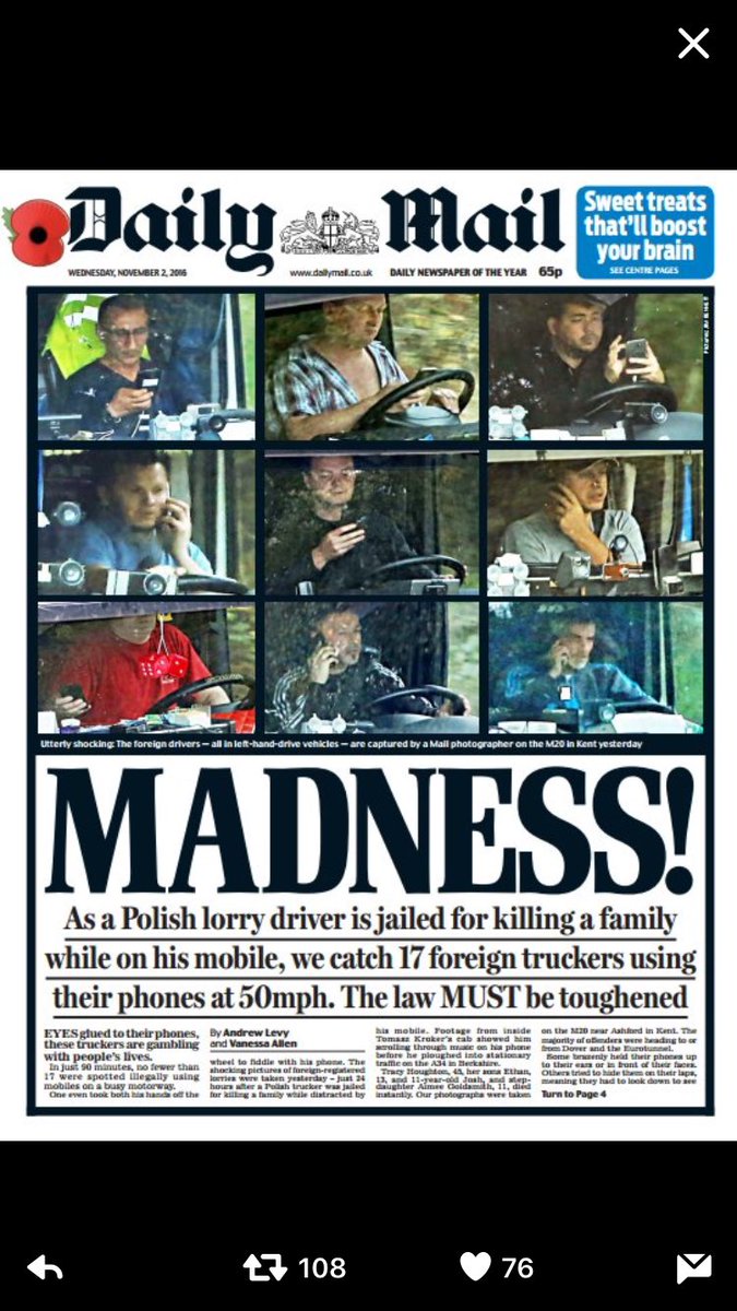 A Daily Mail spokeswoman said: “The Mail dispatched photographers to a number of locations to monitor continuing mobile phone abuse by lorry drivers. In the event, a disproportionate number of cases came from the M20, all involving foreign vehicles. We simply reported what we found, while stressing in the article that this is a wide-ranging problem which is not restricted to foreign drivers.
